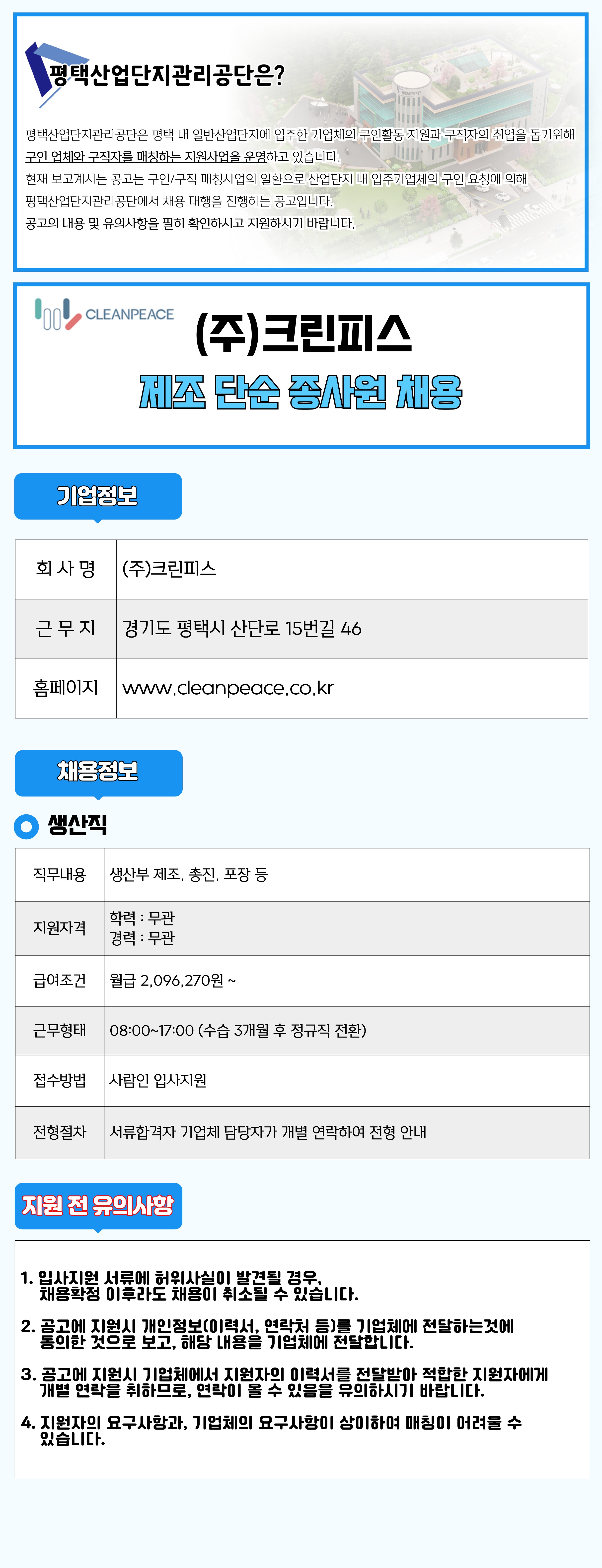 [(사)평택산업단지관리공단] (주)크린피스 제조 단순 종사원 채용(채용시 마감) - 사람인