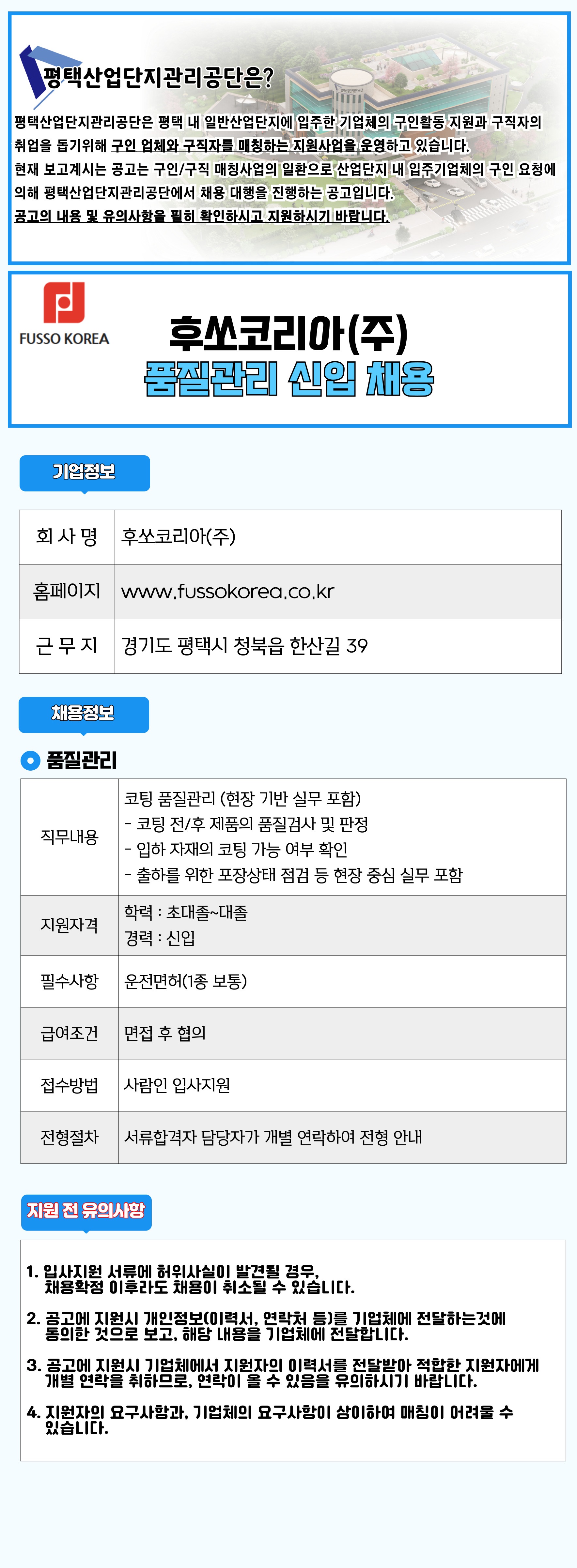 [(사)평택산업단지관리공단] 후쏘코리아(주) 품질관리 신입 채용(채용시 마감) - 사람인