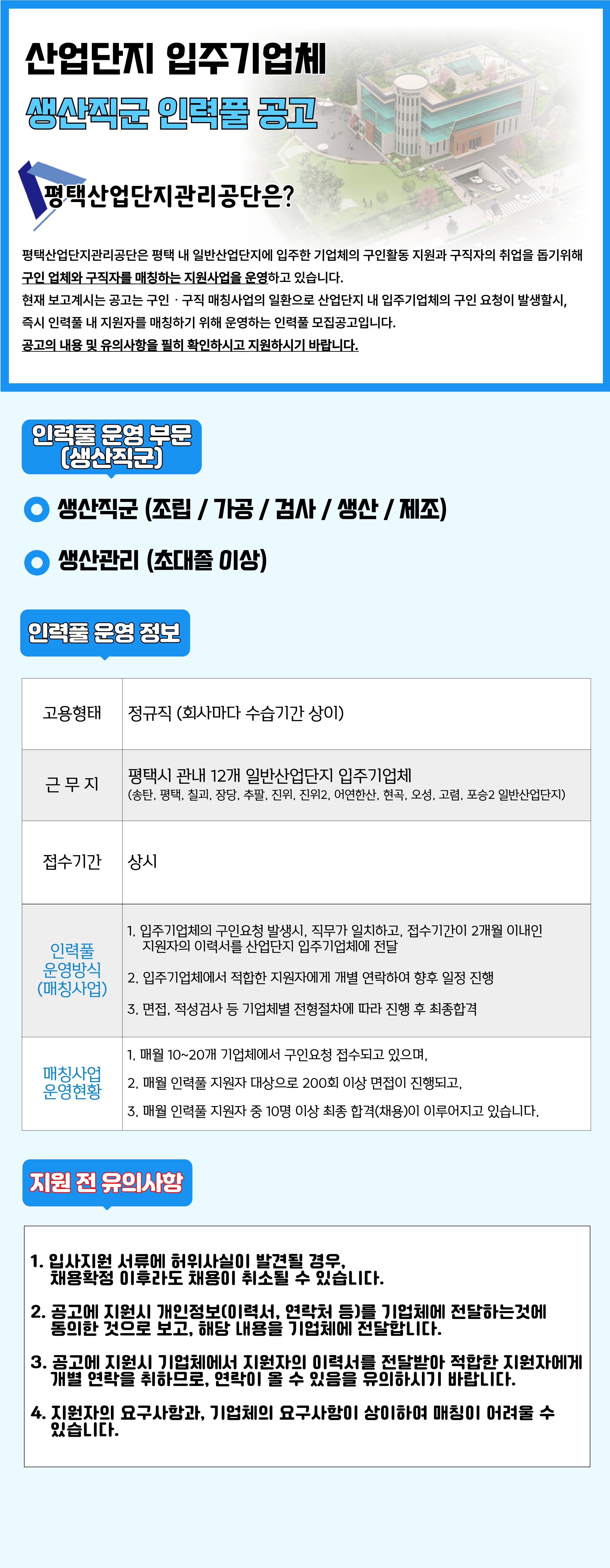 [(사)평택산업단지관리공단] 평택시 산업단지 입주기업체 생산직군 수시채용(상시 채용) - 사람인