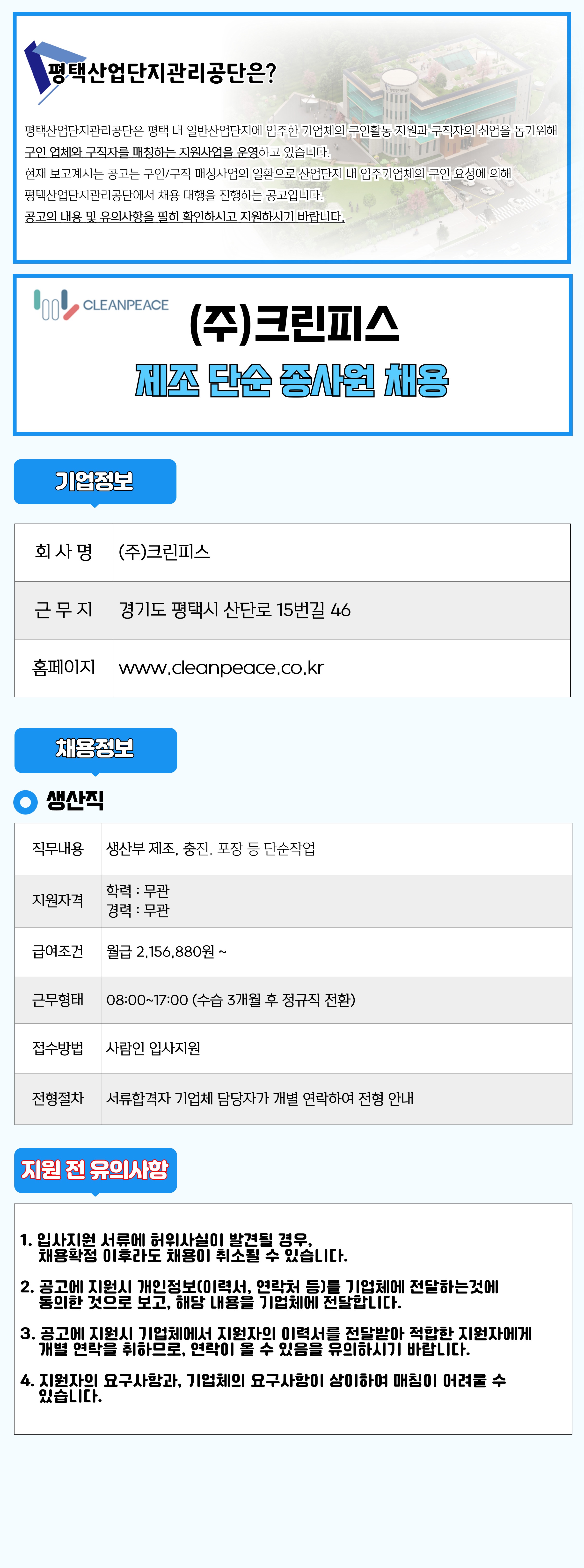 평택시 산업단지 입주기업체 생산직군 상시채용